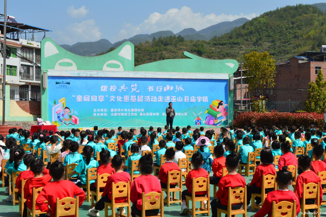 为贯彻落实党中央、国务院关于“完善农村公共服务体系,提高农村教育质量”相关工作要求,探索建立优质文化资源直达基层机制,推动城乡公共文化服务均等共享,助推乡村振兴帮扶工作走深走实,近日,由重庆市少年儿童图书馆主办,水磨村驻村工作队、巫山县图书馆、巫山县庙宇幼儿园共同承办的“馆校共筑·书行山城”文化惠基层活动在巫山县庙宇镇成功举办。重庆市少年儿童图书馆党总支书记、馆长谭必胜,巫山县庙宇镇,巫山县图书馆等相关单位负责人出席。巫山县庙宇幼儿园师生近350人参加此次活动。